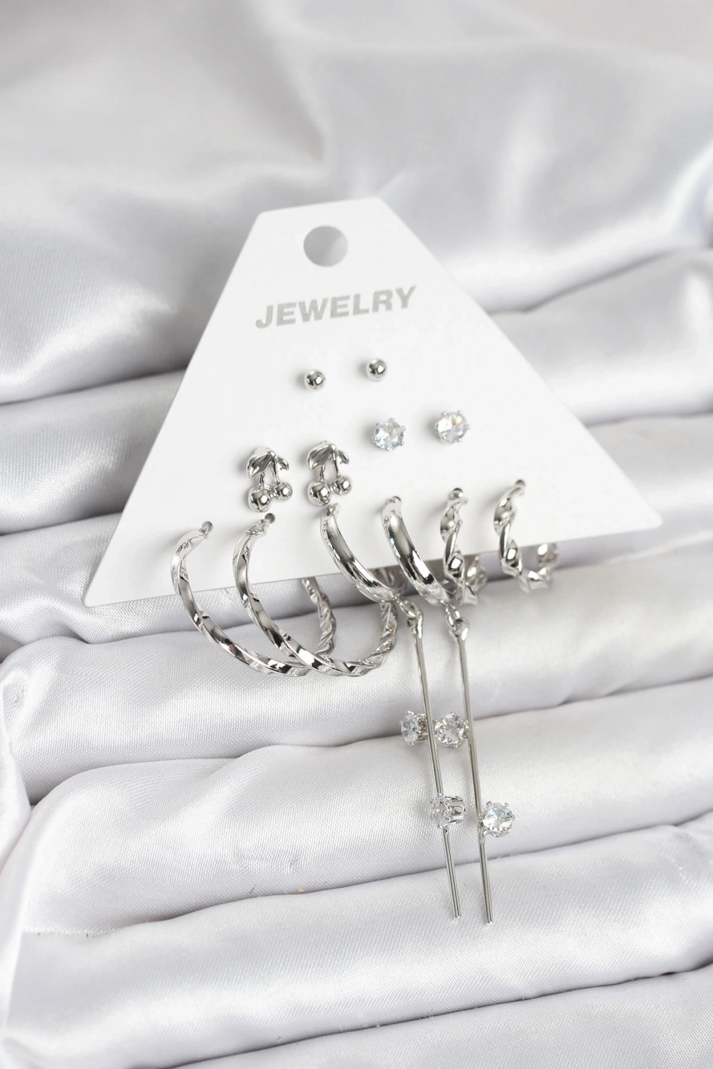 Gümüş Renk Pirinç 6'lı Kadın Küpe Seti